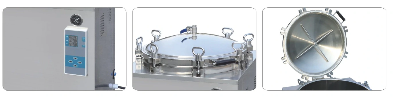 The counter pressure autoclave is a kind of micro-computer controlled sterilizing equipment in medium-size,it directly fills the water into the sterilization chamber for electric heating to generate the high pressure steam as the sterilizingcycle required,then the unit proceeds the sterilization to the articles,the water temperature would rapidly cool down in 3 minutes by the outer connected compressed air injection after the cycle finished,and the articles temperature in chamber could decreased to 30~40℃.The unit is program controlled,there are two operation options for choosing:boiling disinfection the sterilizing temperature of which is lower or equal to 100℃.The unit is with overload protection and buzzer alarm function after sterilization,easy and convenient to operate,safe and reliable.It is applicable to the disinfection and sterilization of food packaging,utensils,instruments and other articles.It is especially suitable for sterility test in food research institutions.